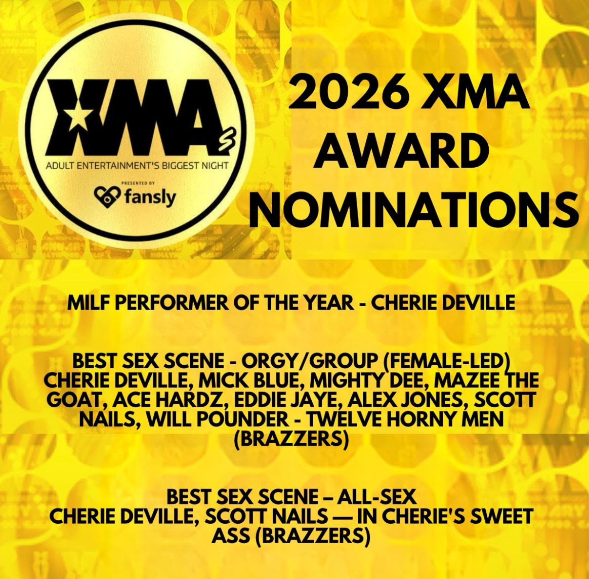DeVille is acknowledged in the categories of ‘MILF Performer of the Year’, ‘Fav MILF Star’, and two major scene nominations – ‘Best Sex Scene – All-Sex’ for in “Cherie's Sweet Ass” and ‘Best Sex Scene – Orgy/Group (Female-Led)’ for “Twelve Horny Men” – both released through Brazzers.
