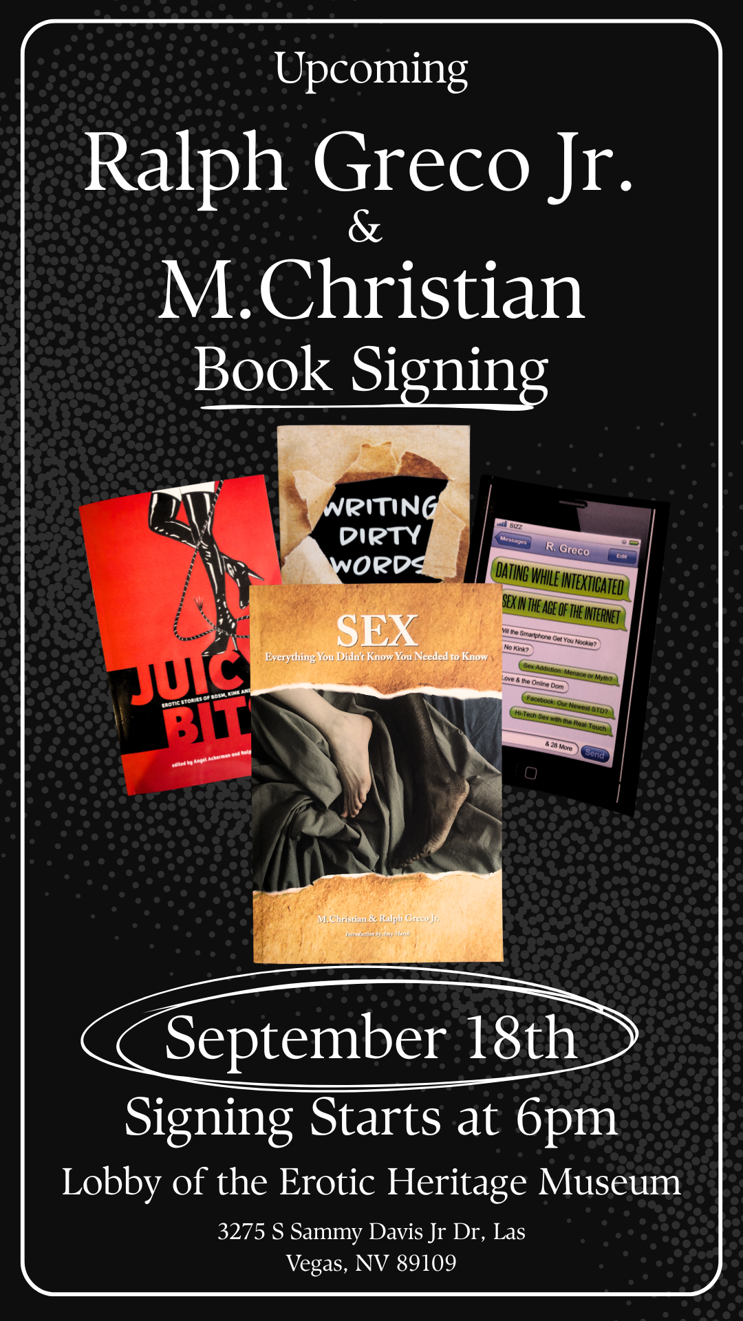 Five book titles will be featured at an Erotic Heritage Museum authors’ meet-and-greet when authors M. Christian and Ralph Greco, Jr. come to the museum, Sept. 18, 2025. The pair of well-published erotica scribes (and besties) will sign any book purchased of their books on sale in the EHM lobby store.